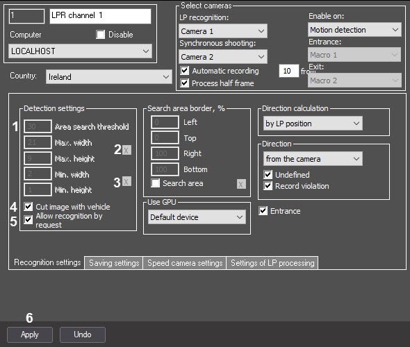 1. Go to the settings panel of the LPR channel object corresponding to the activated software module (see Activating the software module used for identifying the plates).