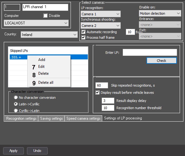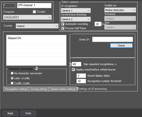 If it is necessary to ignore repeated license plate recognition, in the Skip repeated recognitions, s field (3), enter the time period in seconds greater than 0, during which the captured license plate must not be recognized again.