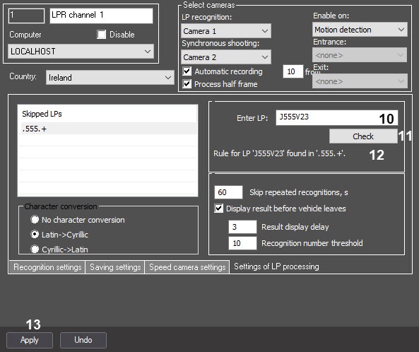 You can check if the specified rule is correct. To do this, enter the test LP in the Enter LP field (10) and click the Check button (11). The result will appear below in the area (12).