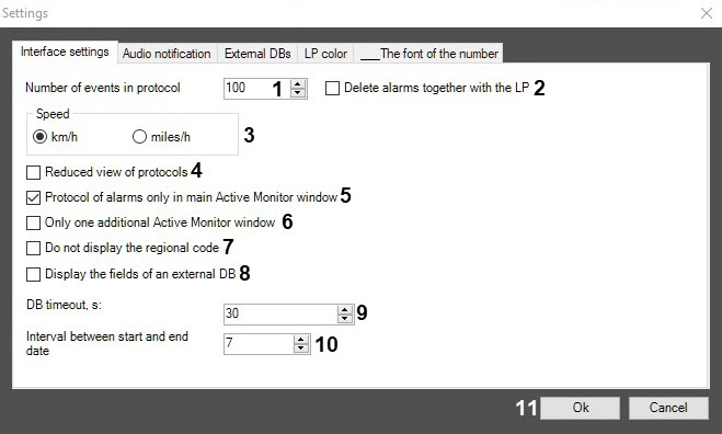 - In the Interval between start and end date field (10), specify in days the expiration time of the suspect vehicle profile. The default value is 7 days. After that, the specified interval will be automatically moved to the form for entering a new suspect vehicle profile in the Active tracking database as a difference between the Start date and Expiration date fields (see Creating the Active tracking database).