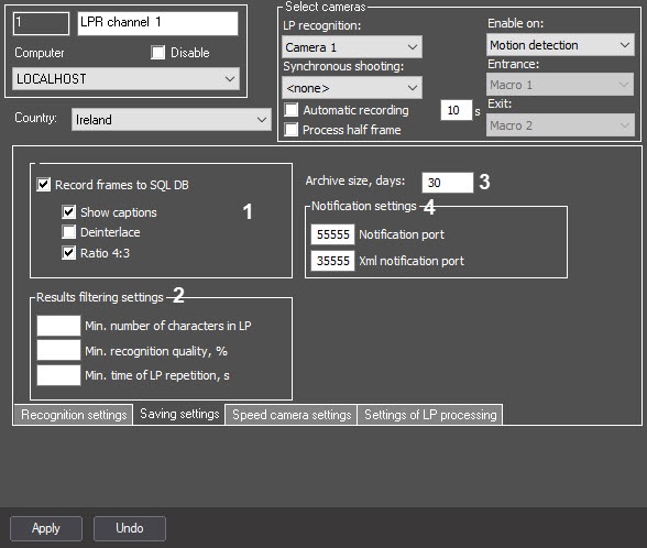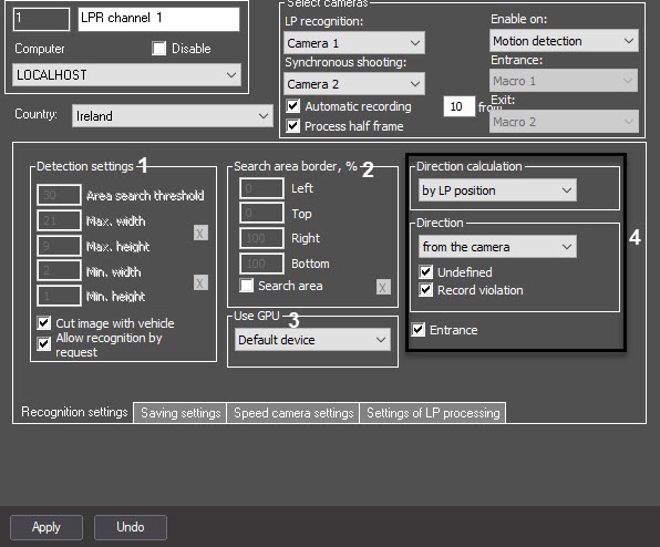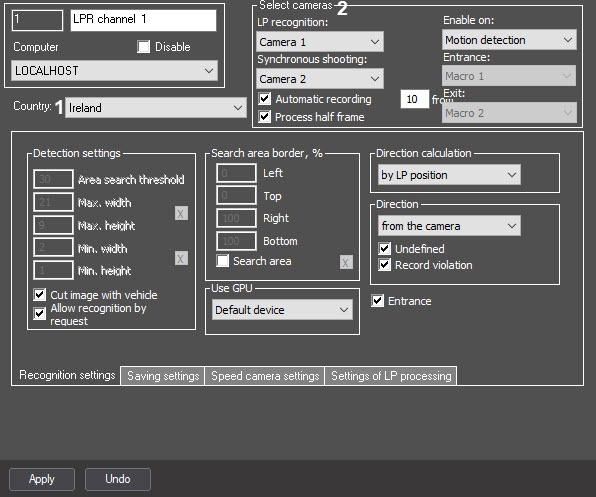 Selection of the country which numbers it is necessary to recognize | List of available national license plate templates | Depending on the recognition module | Depending on the number of available national license plate templates | |||||||