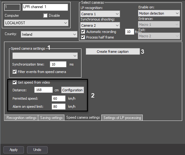 Synchronization time...ms | Enter the value in the text field | The time it takes the car to move from the point of speed detection by the Speed traps server module to the viewing zone of the camera | Milliseconds | Not specified | 0-20000 | |