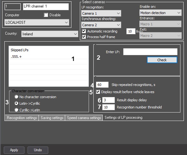 4 | Skip repeated recognitions, s | Enter the value in the text field | Specifies the time period in seconds during which the repeated recognition of one captured license plate will be ignored by the system | Seconds | 0 | >=0 |