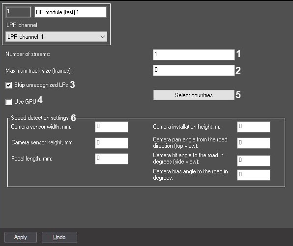 1 | Number of streams field | Enter the value in the text field | Sets the number of streams that the RR SDK will use in parallel computations. A value of 0 disables the calculating process paralleling for the license plate recognition | 0 | >=0 |