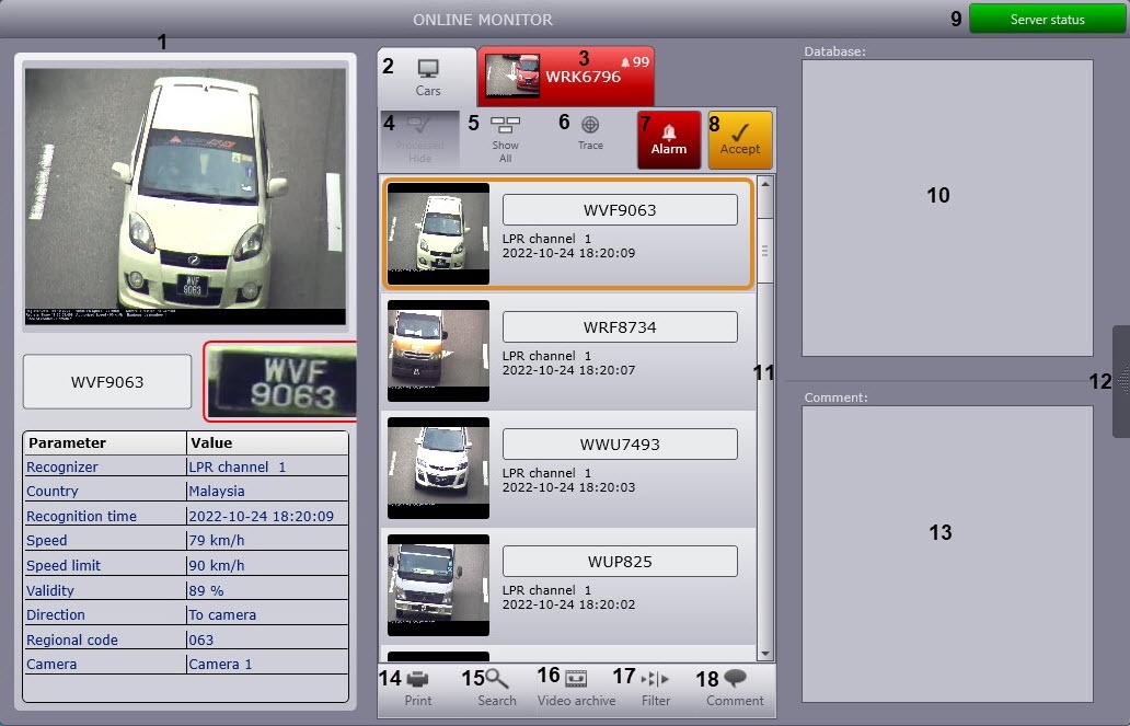 Information about the last passed vehicle or about an event, selected in the identified vehicles protocol or in the alarms protocol