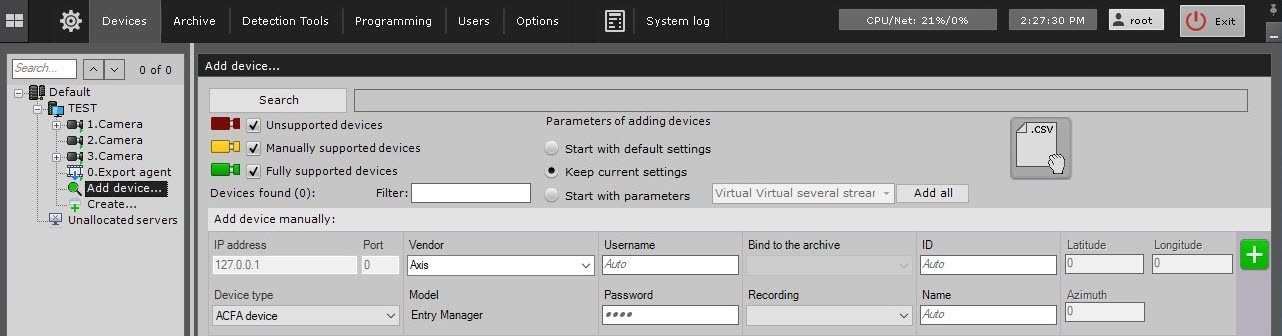 1. Add the device to the system manually using the IP Device Discovery Wizard (see Searching, adding, configuring, and removing IP devices).