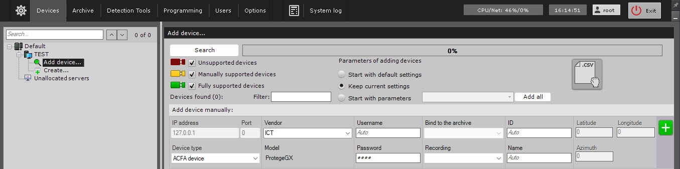 - Add the device to the system manually using the IP Device Discovery Wizard (see Searching, adding, configuring and removing IP devices):