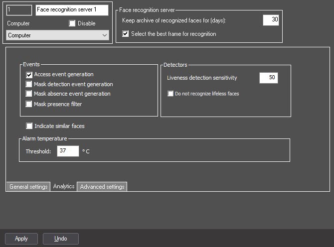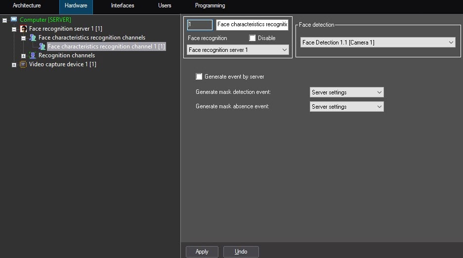 The parameters for enabling/disabling the event generation specified on the settings panel of the Face characteristics recognition channel object are of higher priority than the ones specified on the settings panel of the Face recognition server object. For example, if the Mask detection event generation checkbox is set on the settings panel of the Face recognition server object, and No is selected for the Generate mask detection event parameter on the settings panel of the Face characteristics recognition channel object, then the mask detection event isn't generated, but only for this particular face characteristics recognition channel.