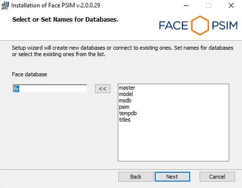 10. A window will appear in which you should specify the name of the database to be created or select an existing database. By default, Face PSIM uses the Fir database as the face database. If you want to use a different database, select it in the list of existing databases (on the right) and click the button next to the Face database field.