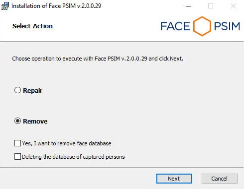 • To remove the reference face database of Face PSIM, set the Yes, I want to remove face database checkbox.