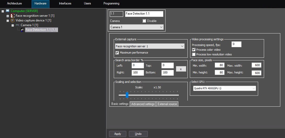 The Face Detection object is created on the basis of the Camera object in the Hardware tab of the System settings window.