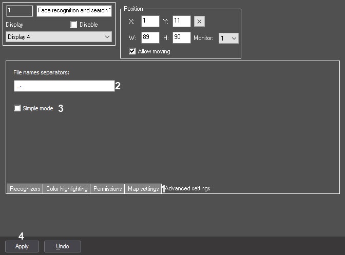 Set the Simple mode checkbox (3) to enable the simple mode of captured and recognized faces monitoring (see Enabling the Simple mode of captured and recognized faces monitoring).