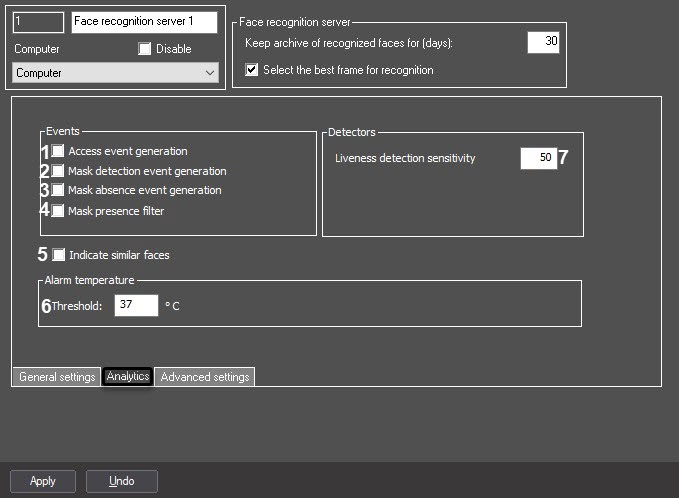 2Mask detection event generationSet the checkboxEnables/disables the event generation in case the mask is detected on the faceBoolean typeNo