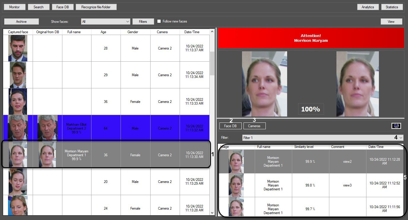 If the Cameras section (3) was selected, then 10 recently recognized faces that are similar to the selected person and filtered by the search filter specified in the Filter drop-down list (4) (see Starting the face search process) will be displayed in the lower right part of the captured faces monitoring panel (5).