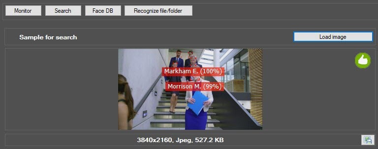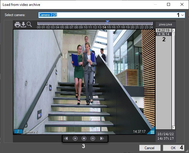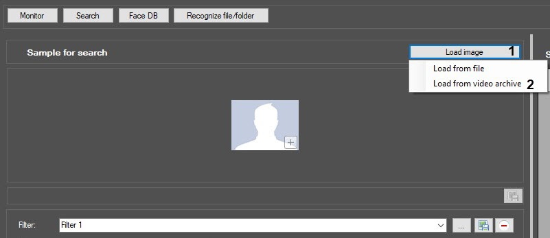 To upload an image from the video archive, click the Load image button (1) and select the Load from video archive value (2) from the list.