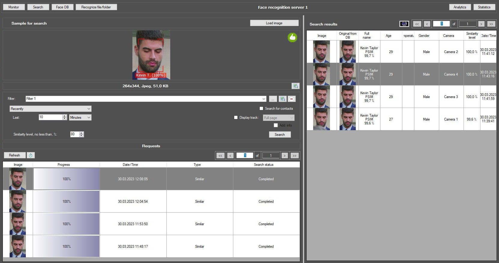 By default, one CPU core is used for face search. Using the CpuCoreCountSearch registry key, you can change the number of cores used (see Registry keys reference guide), which will increase search speed.