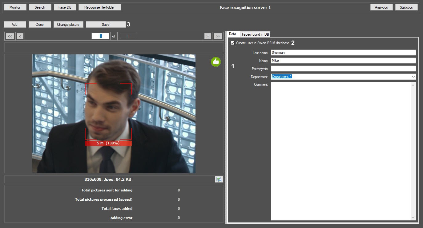 4. Click the Save button (3) to accept the addition of the image to the reference face database.