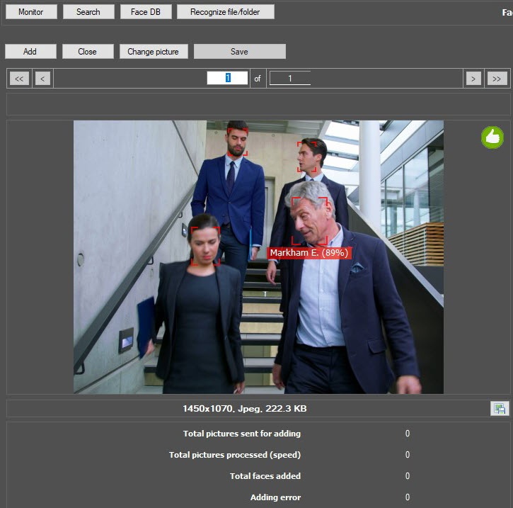 If there are several faces on the added image, they are framed with a red frame and the Save button is disabled. To add a person to the reference face database, left-click on one of the framed faces.