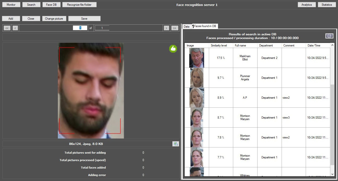 All images added to the reference face database are also listed on the Faces found in DB tab (1), which contains the following information: