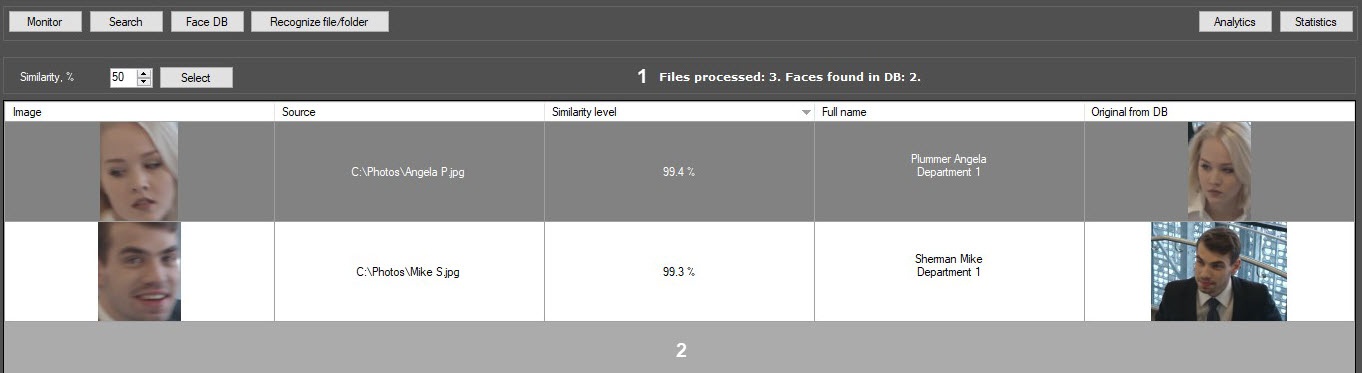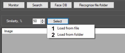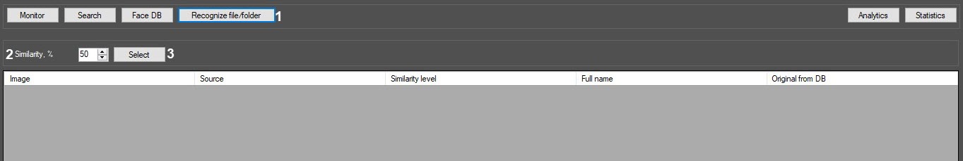 To search by images in the reference face database, click the Recognize file/folder button (1) in the Face recognition and search window and do the following:
