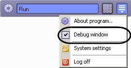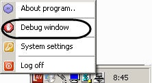 This menu is also available in the Windows notification area (system tray) – left click on thebutton or short click the F8 hot key.- Select the Debug window item on the Main control panel in order to display the Debug window on the monitor. The selected Debug window item is marked with a flag.