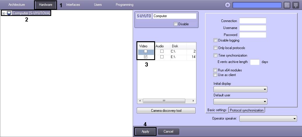 INTELLECT™ software performs video archiving to a storage device. When INTELLECT™ is installed, set the local disks to save the archive to in the Hardware tab of the Computer object.