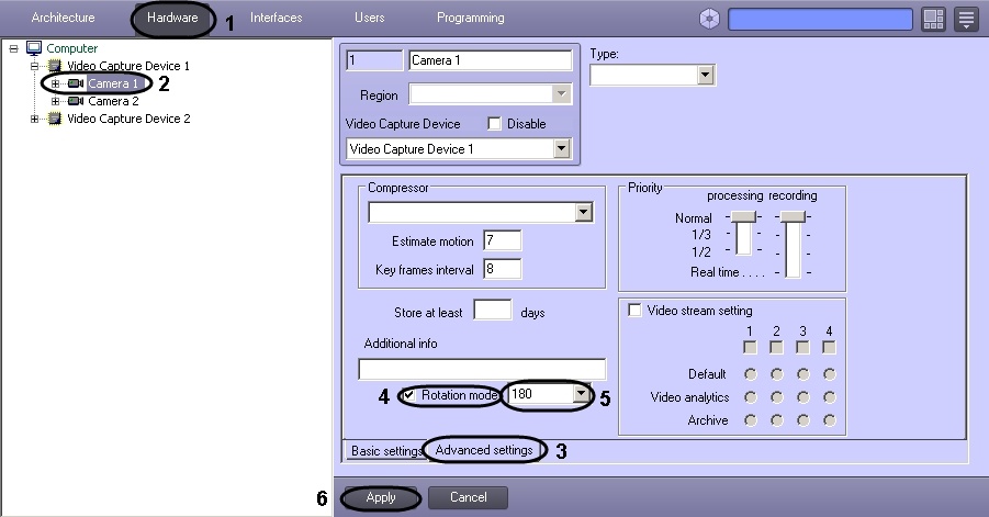In the Intellect software the image from the video camera can be panned while displaying it on the Video surveillance monitor and viewing the video archive. Available rotation angles are 90, 180 and 270 degrees.