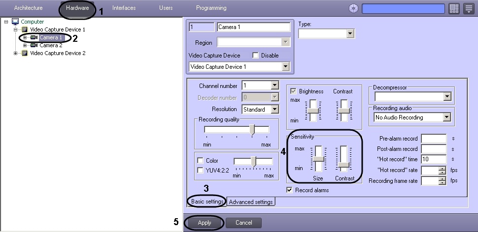 If alarms on camera are registered improperly (for example, a detection tool is triggered by artificial or natural video signal noise (rain, snow, etc), a detection tool does not detect small object motion and high speed motion), a Main motion detection tool is to be configured. The proper setup of a Main motion detection tool allows significantly lowering the probability of unsatisfactory camera alarm detection.- Go to the Hardware tab in the System settings dialog box (1).