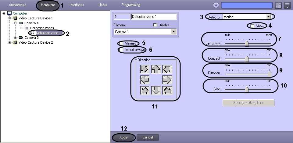 It is recommended to set the value of the Size parameter that is slightly lower than the average size of objects moving in the frame. If a detection tool triggers upon video signal noise, then change the value of the Sensitivity parameter. - By default, a detection tool recognizes motion in any direction. To disable detection of motion in certain directions, click the relevant buttons in the Direction group. A detection tool detects motion in the directions of the pressed arrow buttons and does not detect it in the directions of pulled arrows (11).