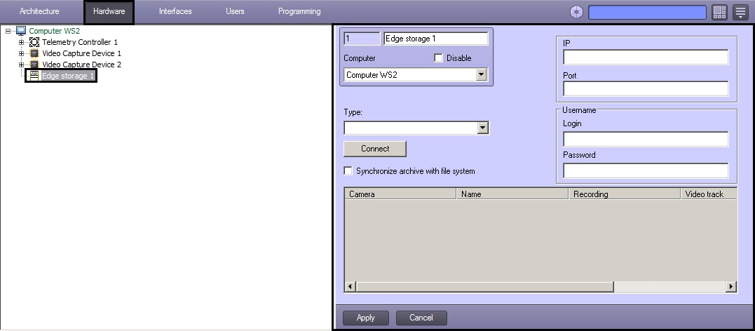 After this one can continue configuring the connection to edge storage (see Configuring the connection to edge storage section) and set the list of cameras to access the edge storage (see Setting the list of cameras to access the edge storage section).