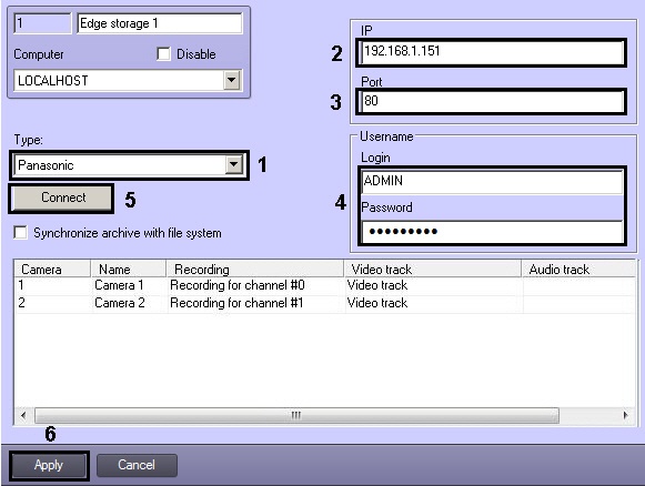 Login and password depend on device settings. See default login and password in manufacturer’s reference documentation on device.- Click Connect (5). If the device is connected then one can set the list of cameras for playing back video from the edge storage archive and match the number of camera in INTELLECT™and edge storage from which the video is to be received (see Setting the list of cameras to access the edge storage section).