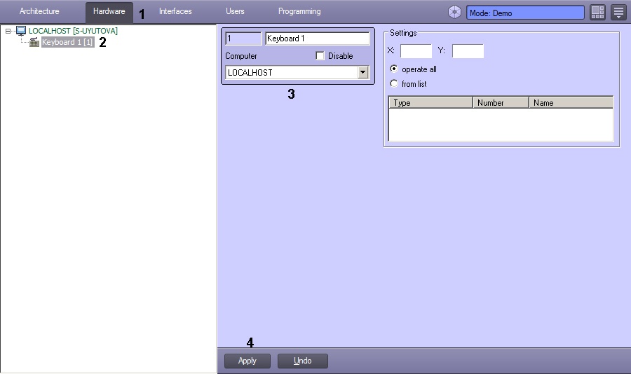- Create the Keyboard system object on the base of the Computer object or select the relevant object in the objects tree on the Hardware tab of Intellect settings panel (2).