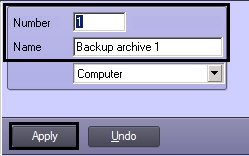 In the appeared window set the number and name of the Backup archive object and then click the Apply button.