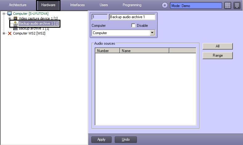2. In the Number drop-downlist, select the id of a microphone related to the camera the archive from which is to be moved to the backup archive (1).