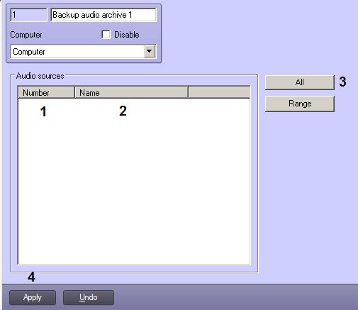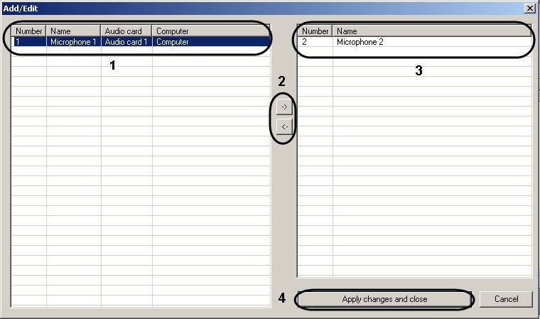 4. Click the Apply changes and close button (4). Microphones from the right part of list will be added in the settings panel of the Backup audio archive object.