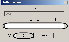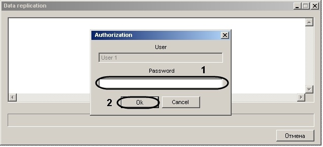 If the query file is not run automatically, then run it from the command prompt with the -pack parameter.- In the Authorization dialog box type-in the password of user who makes the replication (1).