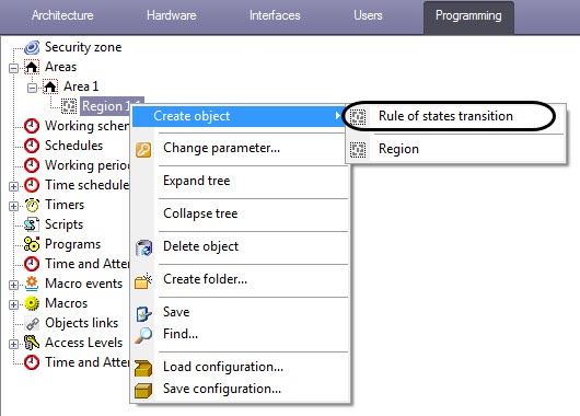 1. Select Create object => Rule of states transition in the context menu of the Region object.