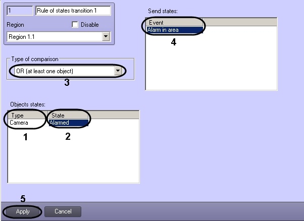 4. In the Event list of the Send states: table select the event generated by the Region object when the rule condition is met (4).