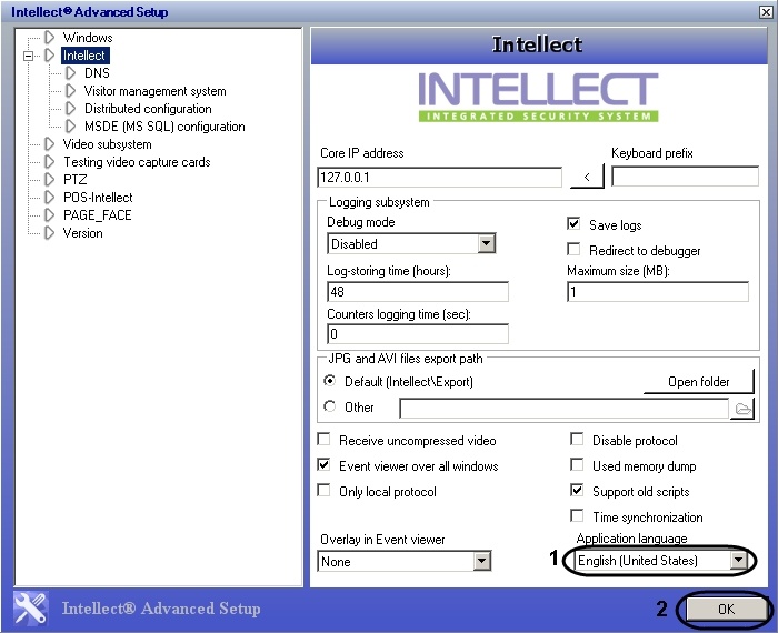 - From the Application language dropdown list, select the desired interface language for the Intellect Software System (1).
