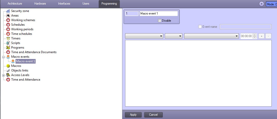 The Macro event object is created and configured on the basis of Macro events object on the Programming tab of the System settings dialog box.