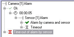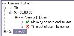 It is required to generate events with the “Alarm by camera and sensor” name, when alarm by Sensor 1 is initiated less than in 5 seconds after alarm by Camera 1. Generate the event with the “Time-out of alarm by sensor” name if alarm by sensor is not initiated or initiated more than in 5 seconds after alarm by camera.