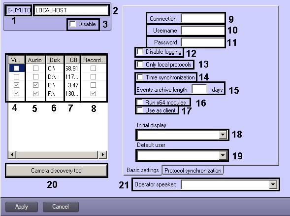 6 | Disk | Automatically, specify the value in the field | Displays the names of local disks, accessible for storing video and audio archive, and also used to specify the network disks used for archive storing. | Names of local disks (Latin characters), names of network disks (UNC-pathes) | - | Depends on the total number of local and network disks |