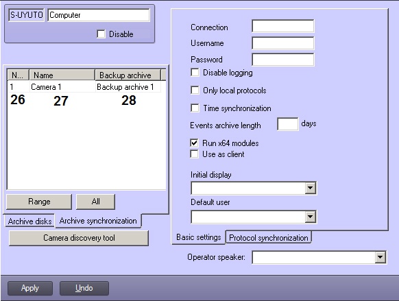 17 | Use as client checkbox | Checkbox | Computer is used as the Client in the distributed video surveillance system | Boolean type | No | Yes – computer is used as Client. No – computer is used as Server or RAW. |