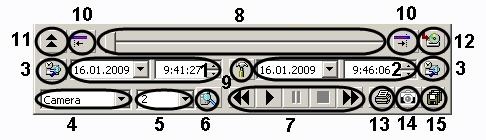 15 | Export to AVI or archive | The button for starting the export of the recording (fragment) in the specified format. A dialog opens for selecting the device name, which made the recording. On export start, a folder is created for saving the exported recordings (by default, C:\Backup). |