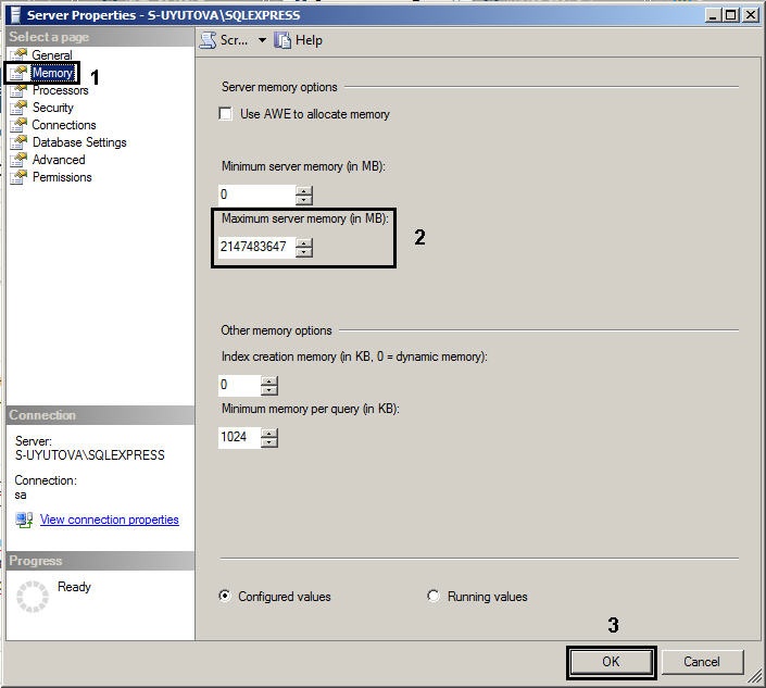 The Maximum memory usage (MB) (3) group will display the amount of space allocated for the selected database. - Drag the slider to a position representing the required amount of memory to be allocated for the SQL server.