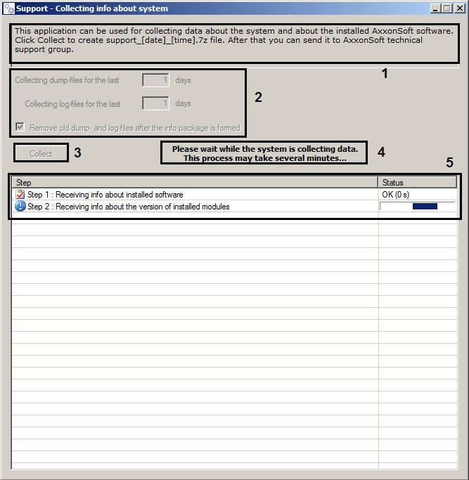 5. Tale of displaying the process of gathering information, it includes two columns Step ans Status. In the Step column there is displayed short characteristic of undergoing process while the information is being gathered. In the Status column there is displayed process-bar and time, spent on information  gathering (5).