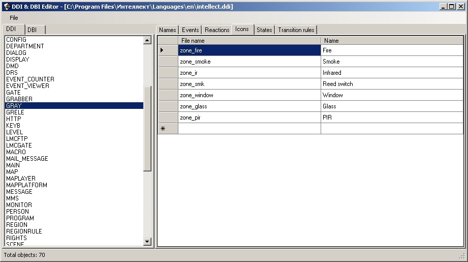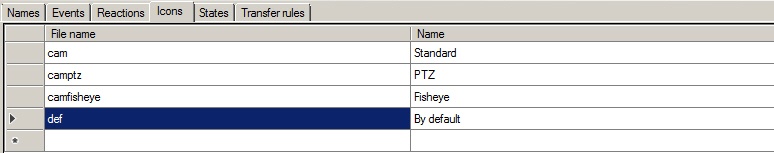 This tab lists the graphical symbols (icons) that represent the selected object on the map. The part of the name used for identifying the file in the .bmp, .jpg or .png format is specified in the File name column. Image files are to be stored in the Bmp folder in the Intellect program folder (for example, C:\ Program Files\Intellect\Bmp).