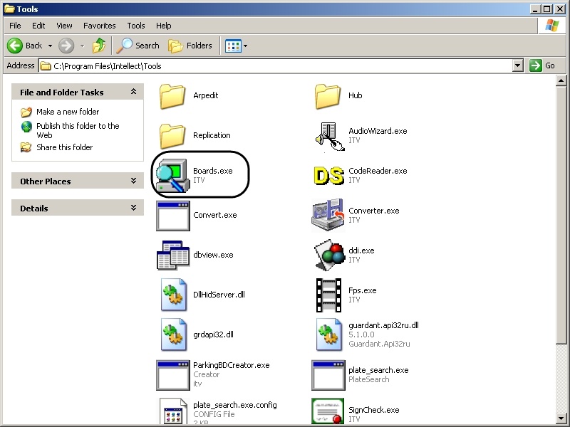 Boards.exe is run from Tools folder of Intellect program installation directory. For example: C:\Program Files\Intellect\Tools\ Boards.exe.