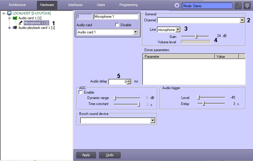 Detailed description of all settings of the Microphone object is given in Administrator's guide.