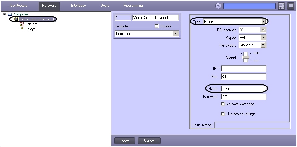 If relays are connected to the Server via IP devices, then select the corresponding type of IP device on the settings panel of the Video Capture Device object; set IP address, name and password in order to connect to camera (see Configuring IP devices section).